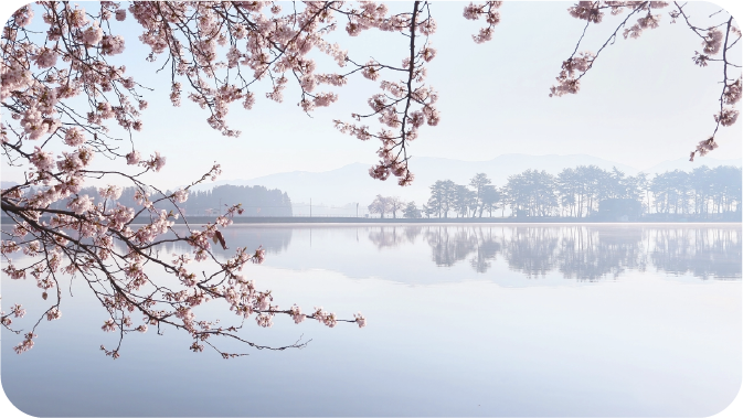 徳良湖は大正時代に造られた、かんがい用の人造湖。花笠踊りは、この工事の際に唄われた土つき唄が起源ともいわれます。春は湖畔の桜並木、冬は越冬の白鳥が見どころ。オートキャンプ場や日帰り温泉「花笠の湯」など施設も整い、1周2.8kmの遊歩道は散策にぴったりです。